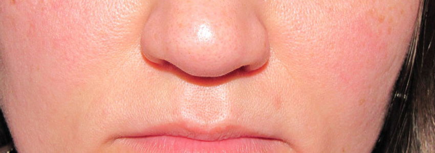 Puede manifestarse como enrojecimiento difuso, vasos sanguíneos prominentes similares a una araña, o pequeñas erupciones en la piel similares al acné.